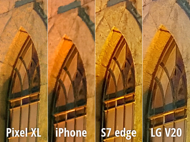 Chciałem uwzględnić ten zbiór zdjęć głównie dlatego, że obejmują niełatwą scenę, tj. taką, która łączy w sobie dwa różne źródła światła. Nie wszystkie aparaty są w stanie właściwie wyważyć chłodne, niebieskawe światła pochodzące z nieba z ciepłym połyskiem, jaki dają latarnie. I tak na przykład niebo na zdjęciach autorstwa iPhone’a i LG V20 posiada swojego rodzaju turkusowy ton. Kolor nieba oddawany przez Pixela XL i Galaxy S7 jest o wiele bliższy rzeczywistości.