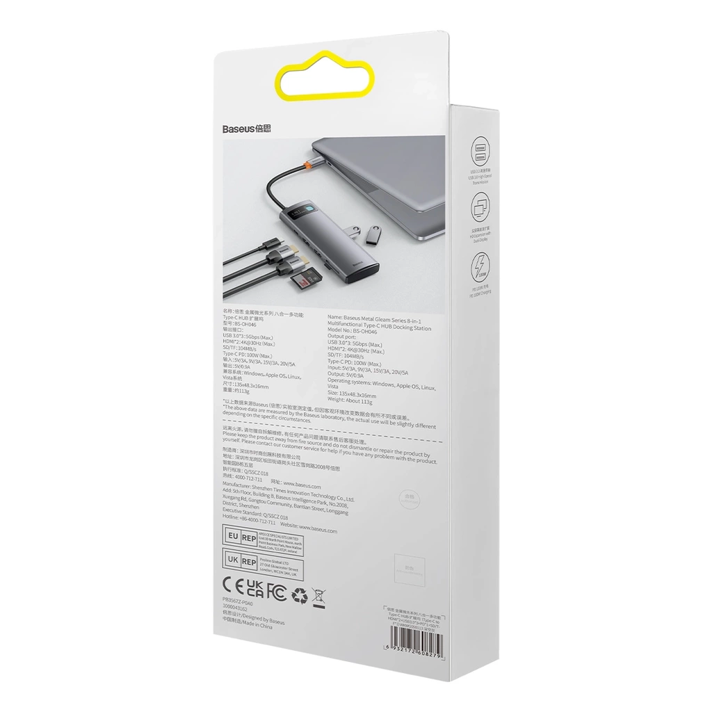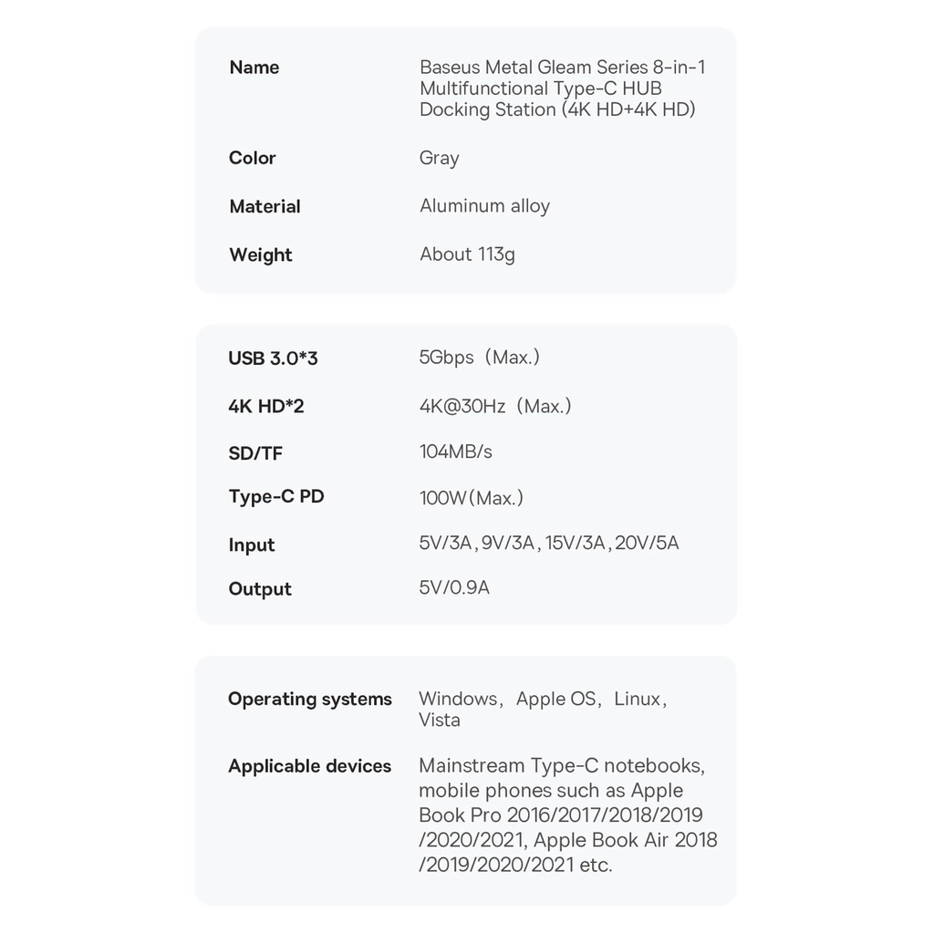 Baseus Metal Gleam Series stacja dokująca HUB 8 w 1 USB Typ C - 2 x HDMI / 3 x USB 3.2 Gen. 1 / 1 x Power Delivery / 1 x czytnik kart SD / 1 x czytnik kart TF szary (WKWG050113)