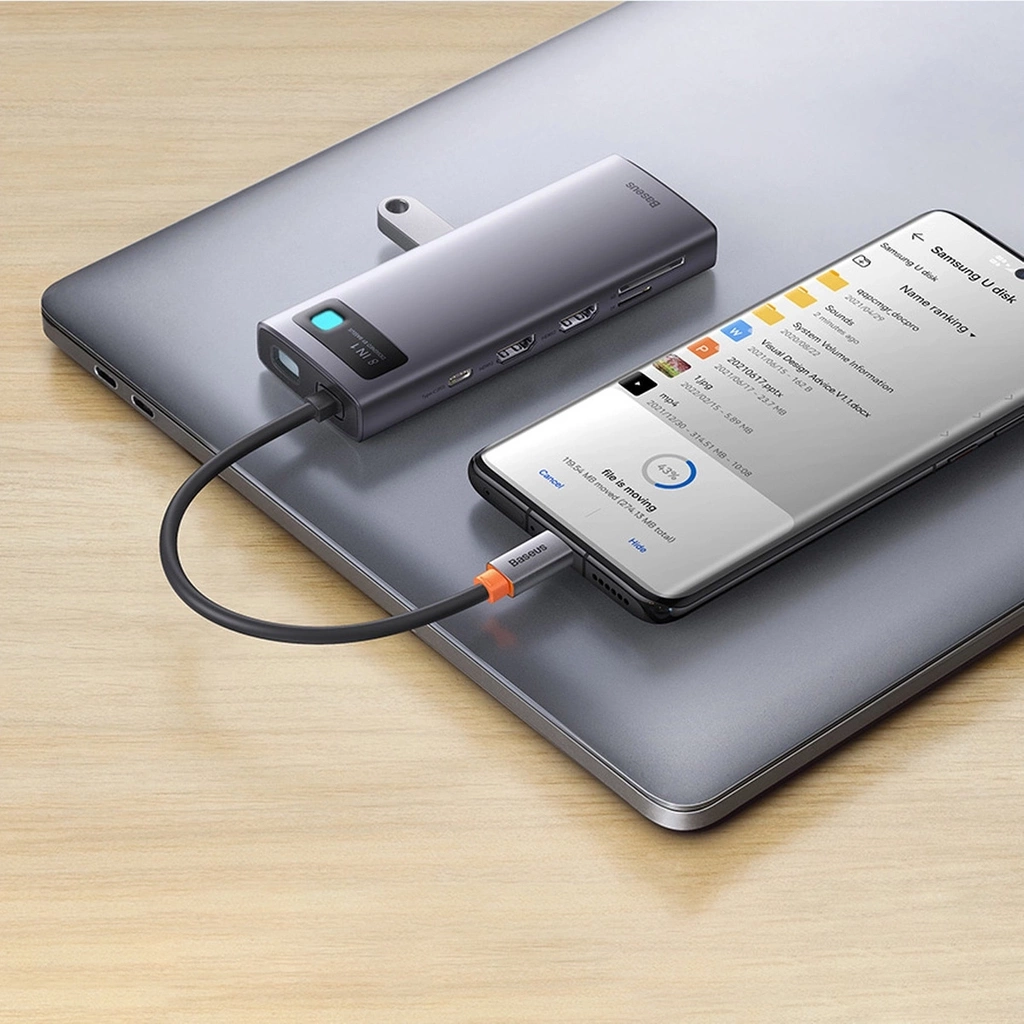 Gadżet od marki Baseus pozwoli Ci na w pełni swobodną pracę lub zabawę. Wszystko dzięki dużej liczbie dostępnych portów oraz gniazd. Nowe laptopy często nie mają wystarczającej ilość gniazd USB lub HDMI. Dzięki HUBowi Baseus nie musisz się martwić ich brakiem. Dodatkowo znajdziesz w nim czytnik kard SD oraz TF.