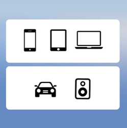 Ikony przedstawiające uniwersalność adaptera audio Wozinsky WTODB z odbiornikiem Bluetooth 5.3 i złączem AUX, od lewej strony - smartfon, tablet, laptop, samochód, głośnik