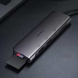 Zwiększ funkcjonalność swojego portu USB-C przy pomocy adaptera UGREEN. Urządzenie posiada 2 wejścia USB 3.0 A, dwa USB-C - jeden z nich to port PD, Wejście HDMI 4K, oraz czytniki kart SD, oraz TF.
