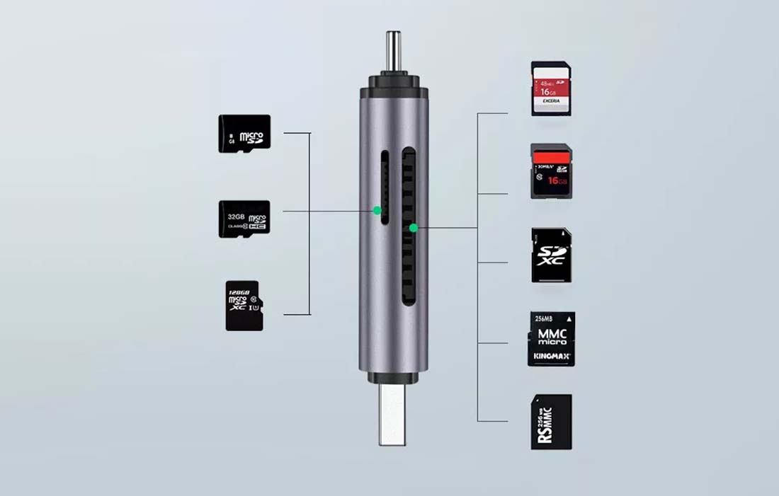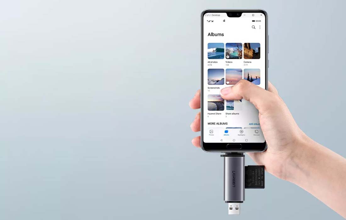 Adapter UGREEN CM304 umożliwia jednoczesny odczyt 2 kart pamięci o pojemności do 2 TB. Zapewnia niezawodną transmisję danych z prędkością do 5 Gbps. Wyróżnia go także szeroka kompatybilność, lekkość i poręczność. Możesz podłączyć go do komputera lub smartfona za pomocą USB lub USB-C.