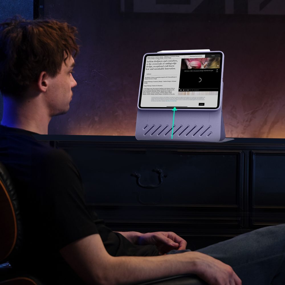 Podniesiony widok ekranu to kolejny atut tego etui. Specjalnie zaprojektowane, oferuje możliwość uniesienia urządzenia na wysokość linii wzroku. Takie rozwiązanie znacznie poprawia wygodę użytkowania, oraz wspomaga utrzymanie komfortowej pozycji, pozwalając Ci siedzieć wyprostowanym nawet podczas dłuższego czasu korzystania z urządzenia.