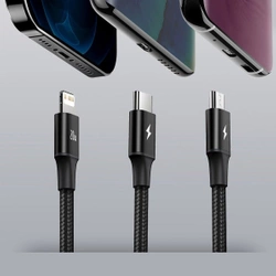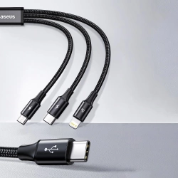 Dzięki długości 1,5 metra kabel Baseus Rapid Series 3w1 gwarantuje pełną elastyczność i komfort użytkowania. Jest wystarczająco długi, by można było go wygodnie używać w samochodzie, przy biurku czy w domu. Bez problemu naładujesz urządzenia nawet w trudno dostępnych miejscach.