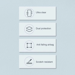 Produkt zapewnia ochronę sprzętu w zakresie 360 ۫. Wbudowany bufor chroni ekran telefonu. Na rogach zastosowano odporna na uderzenia poduszki, które amortyzują upadek sprzętu. Dodatkowo została zapewniona ochrona tylnej kamery, poprzez podniesienie jej obramowania. Akcesorium może pochwalić się dużą odpornością na zarysowania i przezroczystym designem.