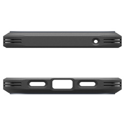 Case jest idealnie dopasowany i nie ogranicza możliwości ładowania bezprzewodowego. Nieco podniesiona forma obudowy wokół aparatu i ekranu chroni go przed zarysowaniami, unosząc telefon tuż nad powierzchnią płaską. Posiada osłony na przyciski i wycięcia na porty.