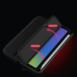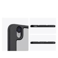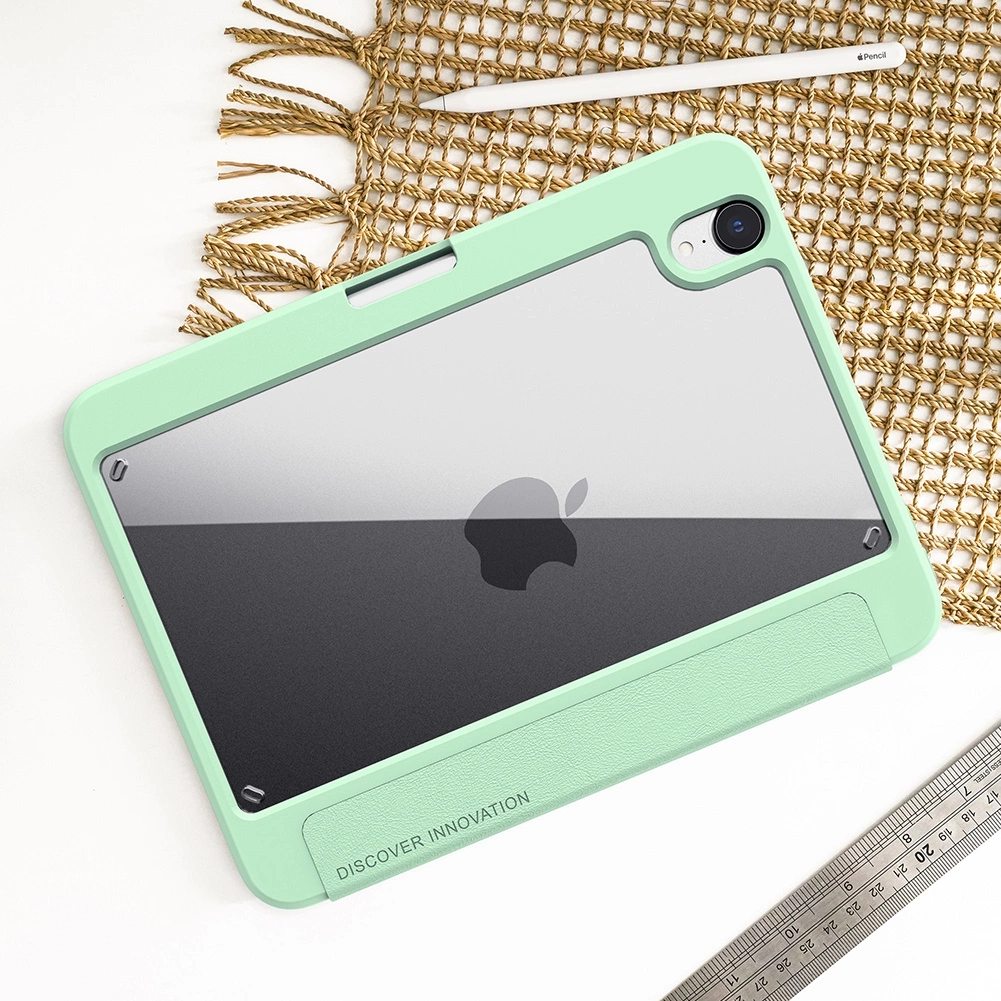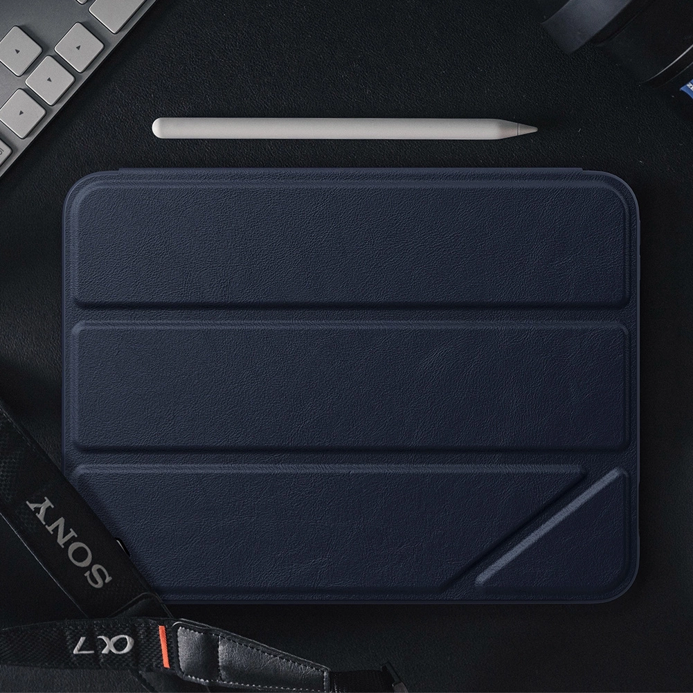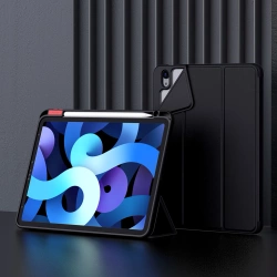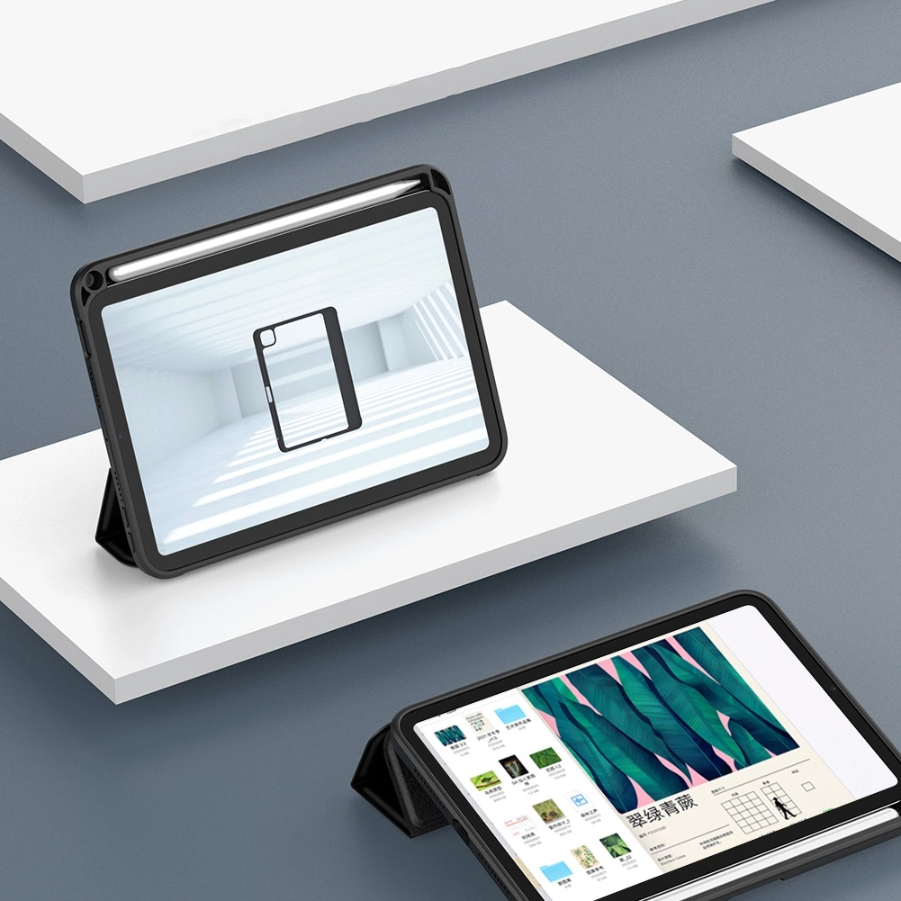 Etui ma bardzo klasyczny, elegancki wygląd – zostało wykonane z dwóch wytrzymałych materiałów (TPU i PC) i powleczone skórą. Klapka jest wyjątkowo trwała i antypoślizgowa. Wbudowany magnes obsługuje funkcję automatycznego wybudzania i uśpienia iPada. Składana konstrukcja chroni obiektyw tabletu i może zmienić się w prostą podstawkę. Etui posiada również wbudowane miejsce na Apple Pencil.
