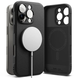 Etui z serii Onyx Magnetic Magsafe od firmy Ringke wykonane jest z miękkiego i wytrzymałego tworzywa termoplastycznego, dodatkowo wzmocnionego na krawędziach by jak najlepiej chronić urządzenie. Nieco podniesiona forma obudowy wokół aparatu i ekranu chroni go przed zarysowaniami, unosząc telefon tuż nad powierzchnią płaską. Posiada osłony na przyciski, wycięcia na porty i smycz.