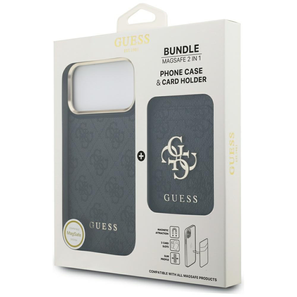 W dolnej części etui znajduje się klasyczne logo Guess, które subtelnie podkreśla prestiż tego akcesorium.