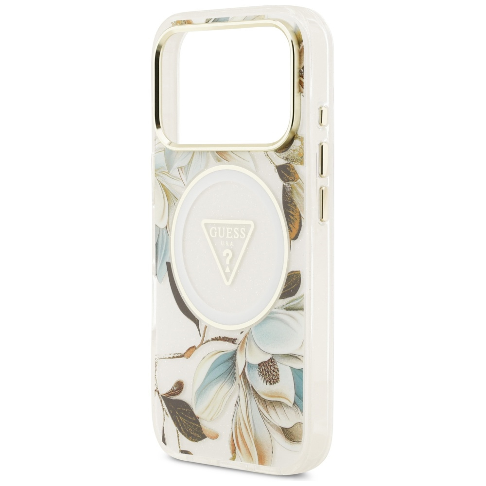 • Etui Guess IML Glitter Flowers Triangle  MagSafe do iPhone 17 Pro Max biały