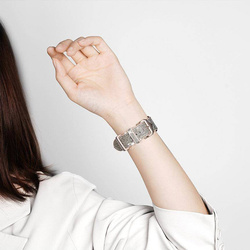 - Dopasujesz go do szerokości swojego nadgarstka. Ma dopasowaną kolorystycznie, metalową sprzączkę