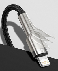 Kabel ma wysoką trwałość, którą udało się uzyskać za sprawą doskonałej jakości materiałów. Mamy tu elementy ze stopu cynku z powłoką UV, które są odporne na blaknięcie i utlenianie, a także gumowe elementy chroniące porty w telefonie i metalowe końcówki wtyczek. Kabel jest chroniony od zewnątrz przez nylonową plecioną obudowę, dlatego nie odkształca się i nie łamie w wyniku częstego zginania. Po złożeniu zepniesz go wygodnie rzepem załączonym do zestawu.