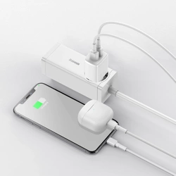 Ładowarka od Baseus pozwoli Ci zrezygnować z noszenia ze sobą dwóch ładowarek. Wszystko za sprawą specjalnego projektu. W górnej części wtyczki znajdują się dwa wejścia USB. Dzięki temu rozwiązaniu, możesz zrezygnować z dwóch osobnych ładowarek i zastąpić ją jedną, co jest zdecydowanie praktyczniejsze i zajmuje mniej miejsca w torebce czy plecaku. Dodatkową zaletą tego rozwiązania jest możliwość ładowania dwóch urządzeń jednocześnie, zajmując wyłącznie jedno gniazdko.