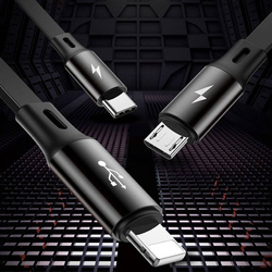 - Płaski, rozwijany kabel USB z 3 wtyczkami: USB-C, micro USB oraz Lightning. Pojedynczy przewód, który pozwala naładować każdy sprzęt wyposażony we wspomniane złącza (oraz przesłać dane za pomocą wtyczki Lightning). Idealny dla osób posiadających kilka urządzeń różnych producentów.