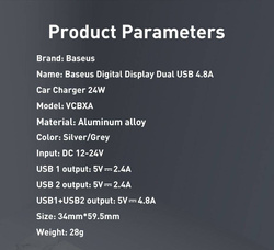 - Prąd wyjściowy: USB1/USB2: 5V/2,4A; USB1 + USB2: 5V/4,8A; 24W max