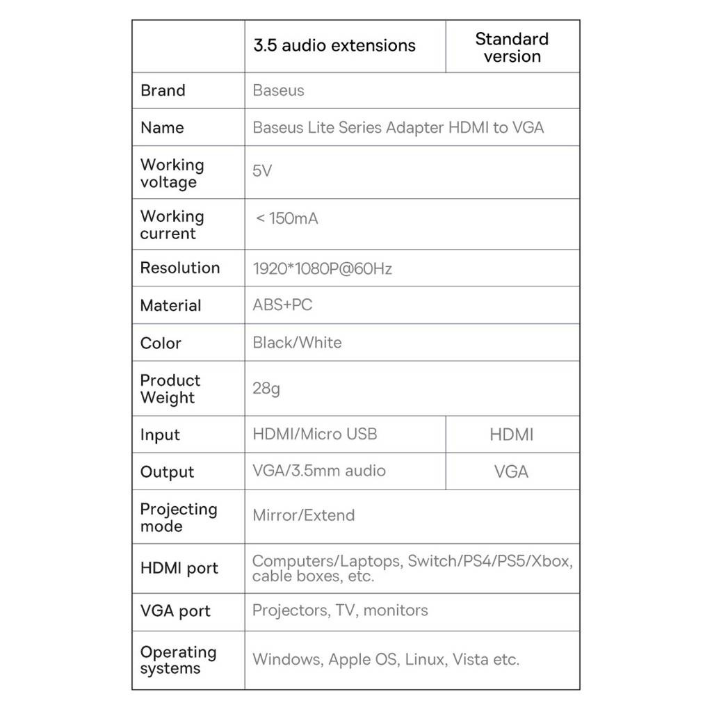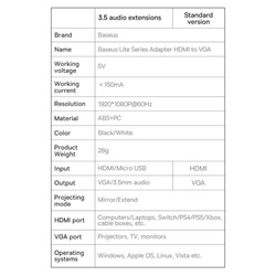 Baseus Lite Series WKQX010102 to przejściówka ze złącza HDMI na VGA z dodatkowymi złączami micro USB (do zasilania) i AUX 3.5mm mini jack umożliwiająca podłączenie nowego laptopa, konsoli czy odtwarzacza multimedialnego do starszego telewizora, monitora lub projektora. Doskonały gadżet pozwalający na korzystanie z najnowszego mobilnego sprzętu na starszej daty odbiornikach. Nie musisz kupować najświeższego modelu telewizora, aby przesłać do niego wysokiej jakości sygnał ze swojego notebooka.