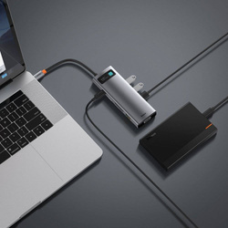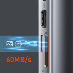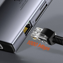 Gadżet od marki Baseus pozwoli Ci na w pełni swobodną pracę lub zabawę. Wszystko dzięki dużej liczbie dostępnych portów oraz gniazd. Nowe laptopy często nie mają gniazda RJ45, które dla graczy jest dość istotnym elementem. Dzięki HUBowi Baseus nie musisz się martwić jego brakiem. Dodatkowo znajdziesz w nim czytnik kard SD oraz TF.
