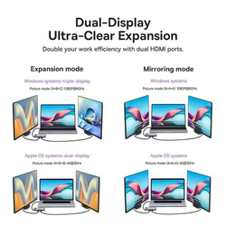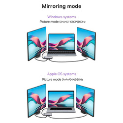 Jeżeli chcesz oglądać filmy na dużym ekranie prosto z Twojego laptopa – nie ma nic prostszego. Gadżet wyposażony jest w dwa gniazda HDMI, dzięki któremu będziesz mógł wygodnie podłączyć laptopa do telewizora i cieszyć się wysoką jakością odtwarzanych filmów. Dodatkowo, w przypadku podłączenia kolejnego monitora HUB może działać w trybach: rozszerzenia obrazu, bądź jego kopiowania.