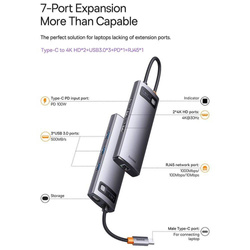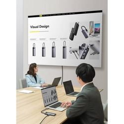 Baseus Metal Gleam Series stacja dokująca HUB 7 w 1 USB Typ C - 2 x HDMI / 3 x USB 3.2 Gen. 1 / 1 x Power Delivery / 1 x RJ-45 Ethernet szary (WKWG040113)