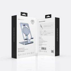 Konstrukcja produktu umożliwia odłączenie panelu indukcyjnego od podstawki, dzięki czemu z powodzeniem naładujesz na przykład smartfona. Kompaktowy, składany design modelu PowerHold Mini pozwala zabrać go ze sobą praktycznie wszędzie. W produkcji wykorzystano wytrzymały stop aluminium, nakładając na niego nasadki antypoślizgowe. Co więcej, posiada również regulację kąta nachylenia.