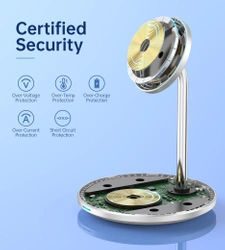 Jeśli szukasz maksymalnej wygody i zależy Ci na utrzymaniu na swoim biurku idealnego ładu, to prezentowany gadżet na pewno przypadnie Ci do gustu. To praktyczny stojak, na którym możesz umieścić swój telefon za pomocą wbudowanego magnesu. Wygodnie przeprowadzisz spotkanie on-line czy nagrasz vloga bez konieczności trzymania smartfona w dłoni. Jednak to nie wszystkie udogodnienia, które oferuje to akcesorium. Jego największą zaletą są aż dwie ładowarki indukcyjne, które szybko naładują Twoje urządzenia elektroniczne. Jedna znajduje się w elemencie utrzymującym telefon, a druga w podstawie. Możesz zasilać dwa sprzęty jednocześnie i robić to w pełni bezprzewodowo!