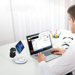 Dzięki niej nie musisz już tracić czasu na kolejne ładowanie każdego z użytkowanych urządzeń. Dostosowana konstrukcja modelu pozwoli Ci na jednoczesne ładowanie telefonu, airpoda i Apple Watcha.