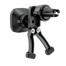 Magnetyczny uchwyt samochodowy do zamontowania na kratce wentylacyjnej auta. Niezwykle prosty w obsłudze, wystarczy odłożyć na niego telefon, a silne magnesy przyciągną go natychmiast do siebie. Posiada trójkątną konstrukcję zapewniającą stabilność podczas jazdy, duże możliwości regulacji (w tym obrotu o 360 stopni) oraz gumowe nakładki, dzięki którym nie porysujemy nawiewu. Bez problemu założysz na niego telefon podłączony kablem do ładowarki, nic nie będzie przeszkadzać w jednoczesnym auta.