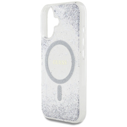 W centralnej części etui znajduje się logo Guess oraz brokatowy pierścień MagSafe, które subtelnie podkreślają prestiż tego etui.