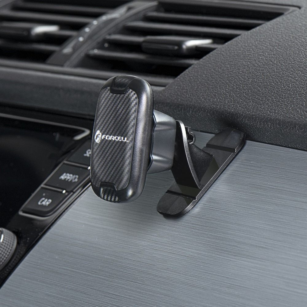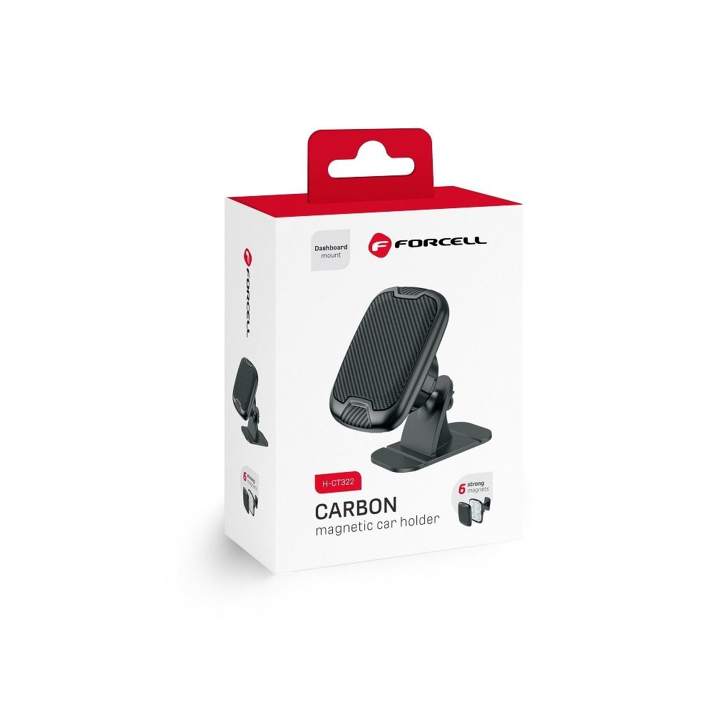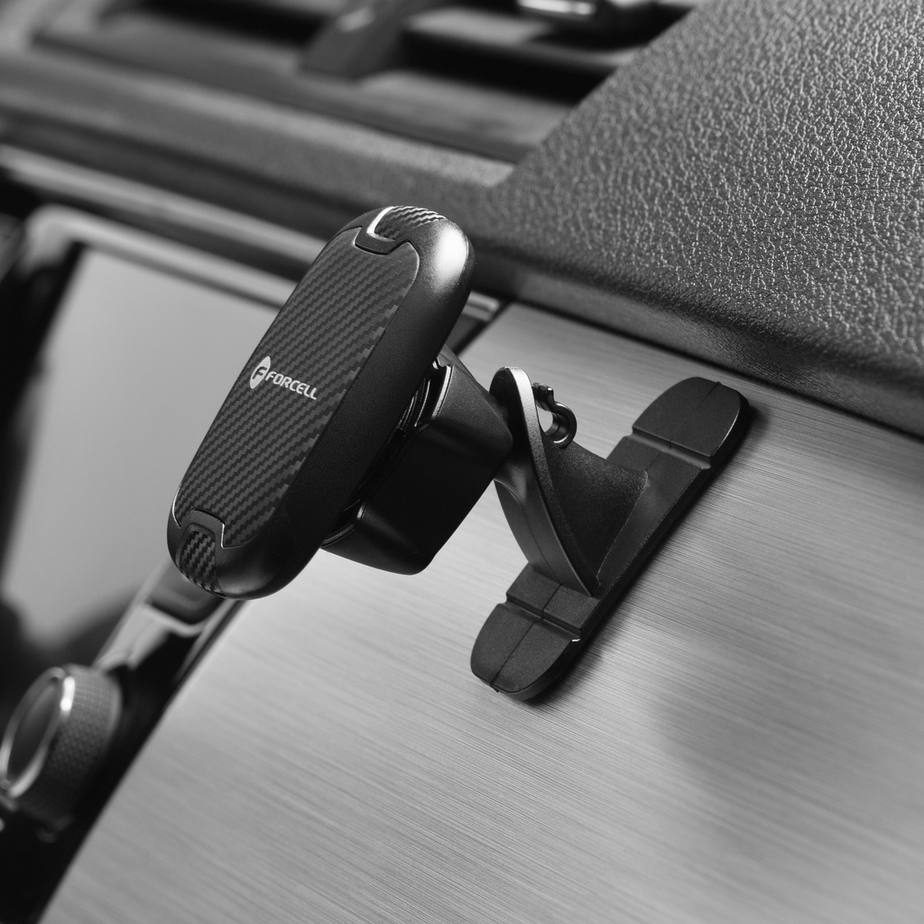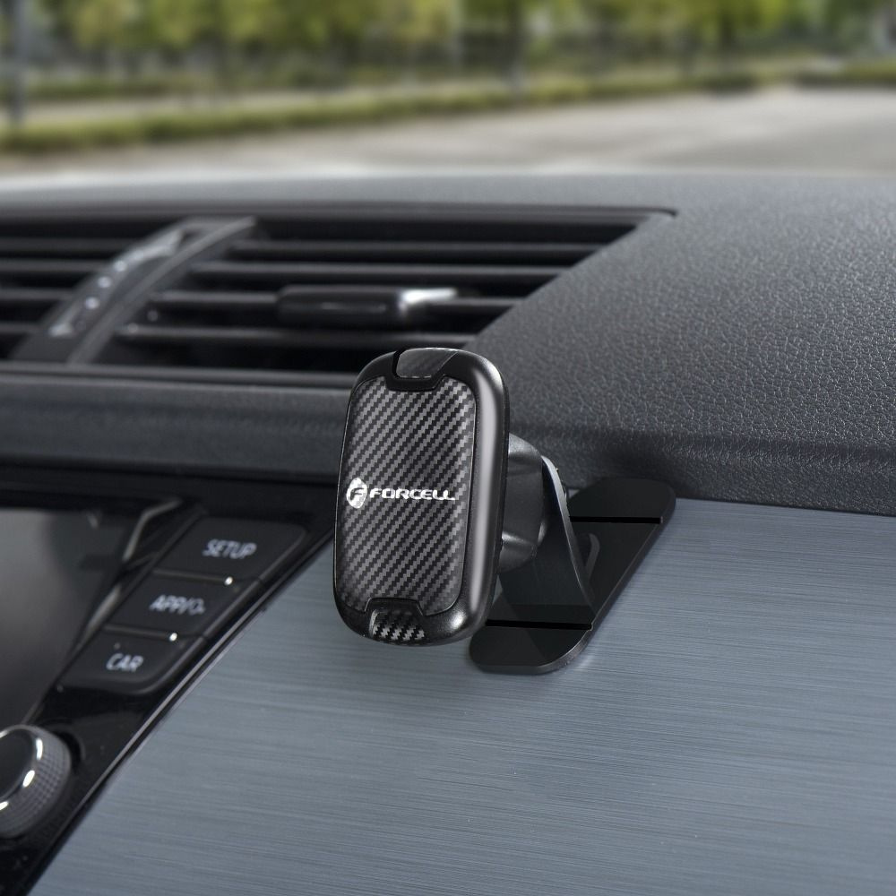 Uchwyt samochodowy FORCELL CARBON H-CT322 do deski. To magnetyczny uchwyt na telefon, który zwiększa komfort podróży i sprawia, że korzystanie ze smartfona jest łatwe i bezpieczne. 6 wbudowanych magnesów zapewnia mocny chwyt, zapobiegając wypadaniu smartfona, i sprawia, że uchwyt jest niezwykle uniwersalny; by z niego skorzystać, wystarczy umieścić metalową płytkę na obudowie telefonu lub etui. Rotacja 360° pozwala na precyzyjne dopasowanie położenia telefonu do własnych potrzeb, poziomo lub pionowo. Klips na kabel umożliwia umieszczenie w nim przewodu w taki sposób, aby się nie plątał i nie przeszkadzał w podróży. Niezwykle kompaktowy: niewielki rozmiar produktu nie blokuje widoczności na drogę oraz ułatwia jego przechowywanie, gdy nie jest używany. Zestaw dwóch metalowych blaszek w zestawie.