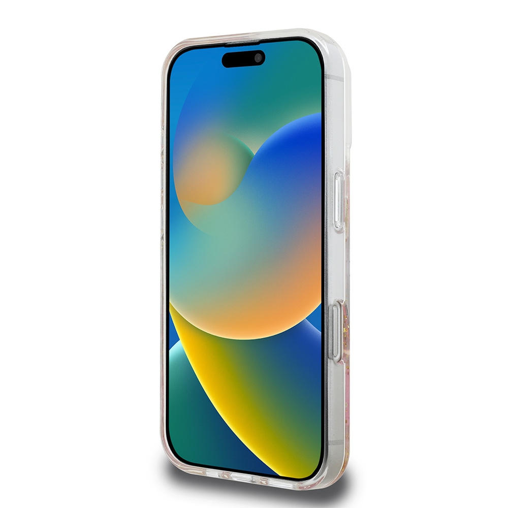 W centralnej części etui znajdują się logo Guess oraz brokatowy pierścień MagSafe, które subtelnie podkreślają prestiż tego etui.