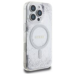 W centralnej części etui znajduje się logo Guess oraz brokatowy pierścień MagSafe, które subtelnie podkreślają prestiż tego etui.