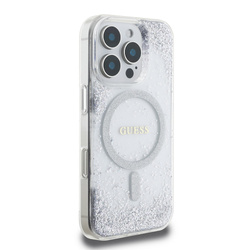 W centralnej części etui znajduje się logo Guess oraz brokatowy pierścień MagSafe, które subtelnie podkreślają prestiż tego etui.