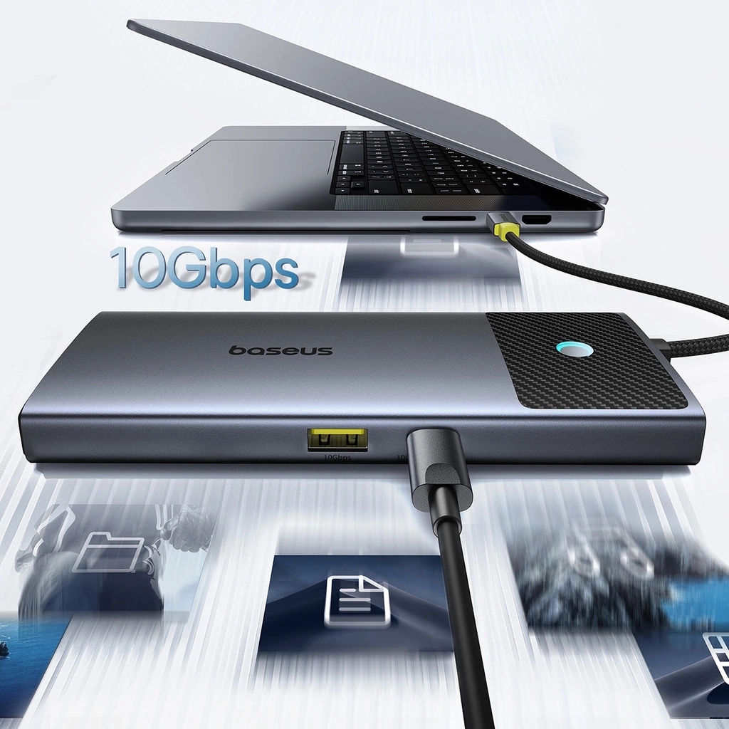 Dzięki prędkości transferu danych do 10 Gbps HUB Baseus Metal Gleam Series II 7w1 umożliwia przenoszenie dużych plików w mgnieniu oka. Teraz przesłanie 20 GB danych zajmuje tylko 20 sekund, co pozwala oszczędzić cenny czas podczas pracy nad dużymi projektami. Niezależnie od tego, czy przenosisz pliki graficzne, wideo czy dokumenty, prędkość tego urządzenia zapewni Ci najwyższą wydajność.