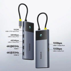 HUB Baseus Metal Gleam Series II 7w1 - dla tych, którzy potrzebują więcej możliwości z jednego urządzenia. Ten wszechstronny HUB pozwala rozszerzyć obraz na wielu ekranach, przenosić pliki z prędkością błyskawicy i szybko ładować laptopa. Dzięki obsłudze podwójnego wyświetlacza 4K (jeden port HDMI obsługuje 4K 60 Hz, a drugi 4K 30 Hz) możesz cieszyć się najwyższą jakością obrazu. Szybki przycisk blokady ekranu i uniwersalna kompatybilność sprawią, że to będzie Twój niezastąpiony HUB.