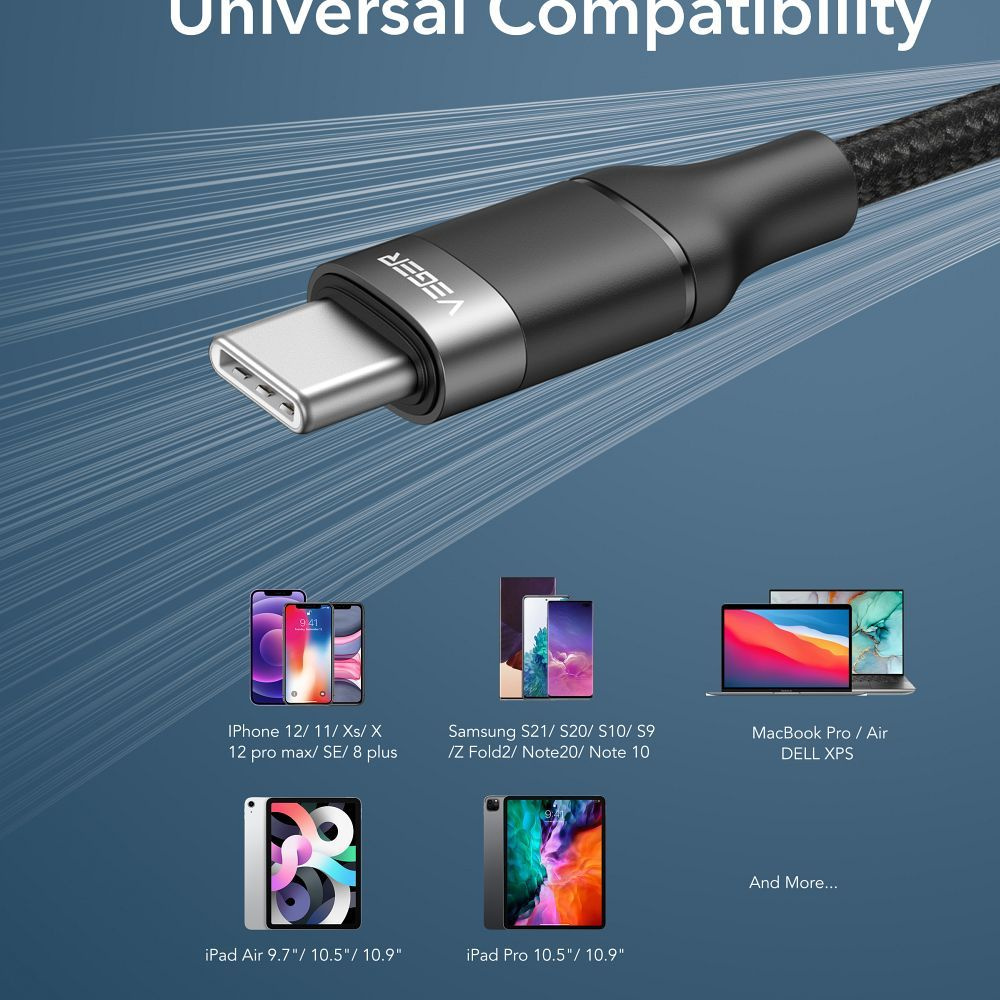 Kabel Veger ze złączami USB-C – USB-C. Wspiera ładowanie PD 100 W i transmisję danych. Charakteryzuje się mocnym oplotem i wzmocnioną konstrukcją.