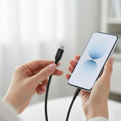 Uniwersalny kabel USB-C o dużej mocy 60 W, umożliwiający szybkie i bezpieczne ładowanie smartfonów, tabletów oraz laptopów. Wykonany z miękkiego, elastycznego silikonu, który zapobiega plątaniu się kabla, a jego wyjątkowa faktura poprawia komfort użytkowania.