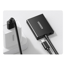 Jednokierunkowy adapter marki Ugreen, który służy do konwersji sygnału analogowego wychodzącego z portu VGA do portu HDMI. Pozwala na podłączenie komputera ze złączem VGA do telewizora, projektora, monitora ze złączem HDMI. Dodatkowo adapter wyposażony jest w złącze zasilania USB-C.