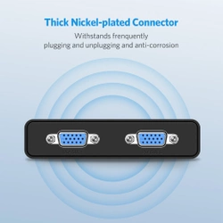 Obudowa urządzenia została wykonana z tworzywa ABS. Zapewnia ono wyjątkową odporność na ciepło i niezrównaną wytrzymałość. Z kolei złącza VGA zostały pokryte niklową powłoką, dzięki której przetrwają nawet długotrwałe użytkowanie, a ponadto są zabezpieczone przed korozją. Rozdzielacz może Ci więc służyć bardzo długo - nie grozi mu zbyt szybkie zużycie lub zniszczenie.