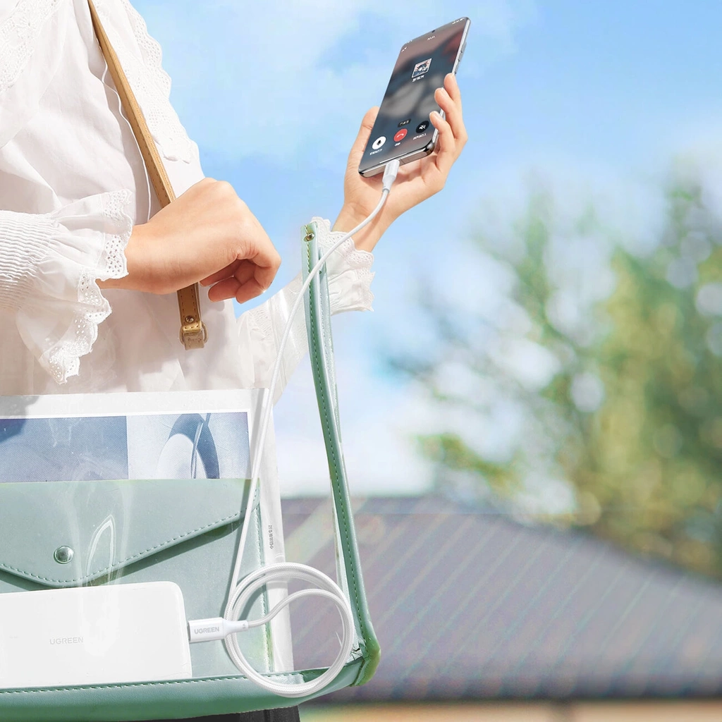 Kabel marki Ugreen przeznaczony do szybkiego ładowania wielu urządzeń, przyjmuje moc na poziomie 100W. Wykorzystuje inteligentny chip do dwukierunkowej komunikacji z urządzeniami, dzięki czemu dostosowuje moc do podłączonych sprzętów, zapewniając bezpieczną i stabilną podaż mocy. Kabel wyróżnia się solidną konstrukcją i umożliwia transmisję danych z prędkością 480 Mbps.