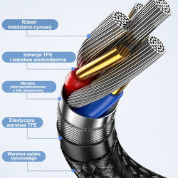 Przewód został wykonany z wielożyłowego splotu miedzianych żył które gwarantują większą stabilność przewodzenia prądu i stabilniejsze ładowanie. Kabl został zabezpieczony warstwą TPE, aluminium oraz oplotu z nylonu co sprawia, iż jest on niezwykle trwały.