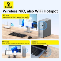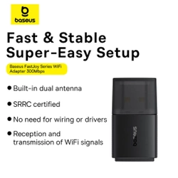 Karta sieciowa USB Baseus BS-OH169 obsługuje połączenia bezprzewodowe z mocą do 20 dBm. Umożliwia transmisje danych z prędkością do 300 Mb/s w paśmie 2,4 GHz. Niewielkie wymiary i niska waga sprawiają, że adapter zmieści się w plecaku, torbie lub torebce. Jest kompatybilny z każdym komputerem, który posiada system Linux lub Windows.