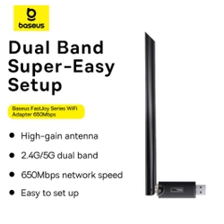 Karta sieciowa USB Baseus BS-OH173 obsługuje połączenia bezprzewodowe w pasmach 2,4 GHz i 5 GHz. Zapewnia transmisje danych z zawrotną prędkością - aż do 650 Mb/s. Działa doskonale z każdym komputerem, który pracuje na systemie operacyjnym Windows lub Linux.