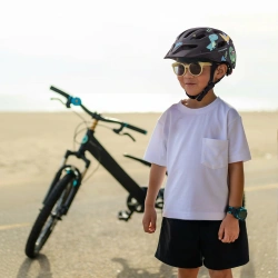 Motyw kolorystyczny oraz nowoczesny design sprawiają, że kask jest atrakcyjny wizualnie i podkreśla indywidualny styl młodego rowerzysty, zachęcając do ciągłego noszenia w różnych warunkach jazdy.