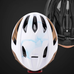 - Ergonomiczny design. Zintegrowana tylna lampka zwiększa widoczność rowerzysty po zmroku, a unikalna kolorystyka oraz sportowa linia podkreślają szosowy charakter kasku.