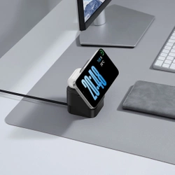 - Dwie jasne diody informują o działaniu ładowarki. Pierwsza dioda odpowiedzialna jest za informowanie o działaniu magnetycznej płytki MagSafe a druga dostarcza informacje o ładowaniu zegarka.