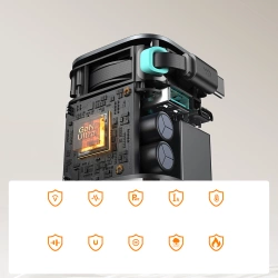 - Chroni przed wieloma zagrożeniami, zwiększając bezpieczeństwo użytkowania. Wyposażona w zabezpieczenia przed nadmiernym prądem, napięciem, mocą, naładowaniem, zwarciem i zakłóceniami.