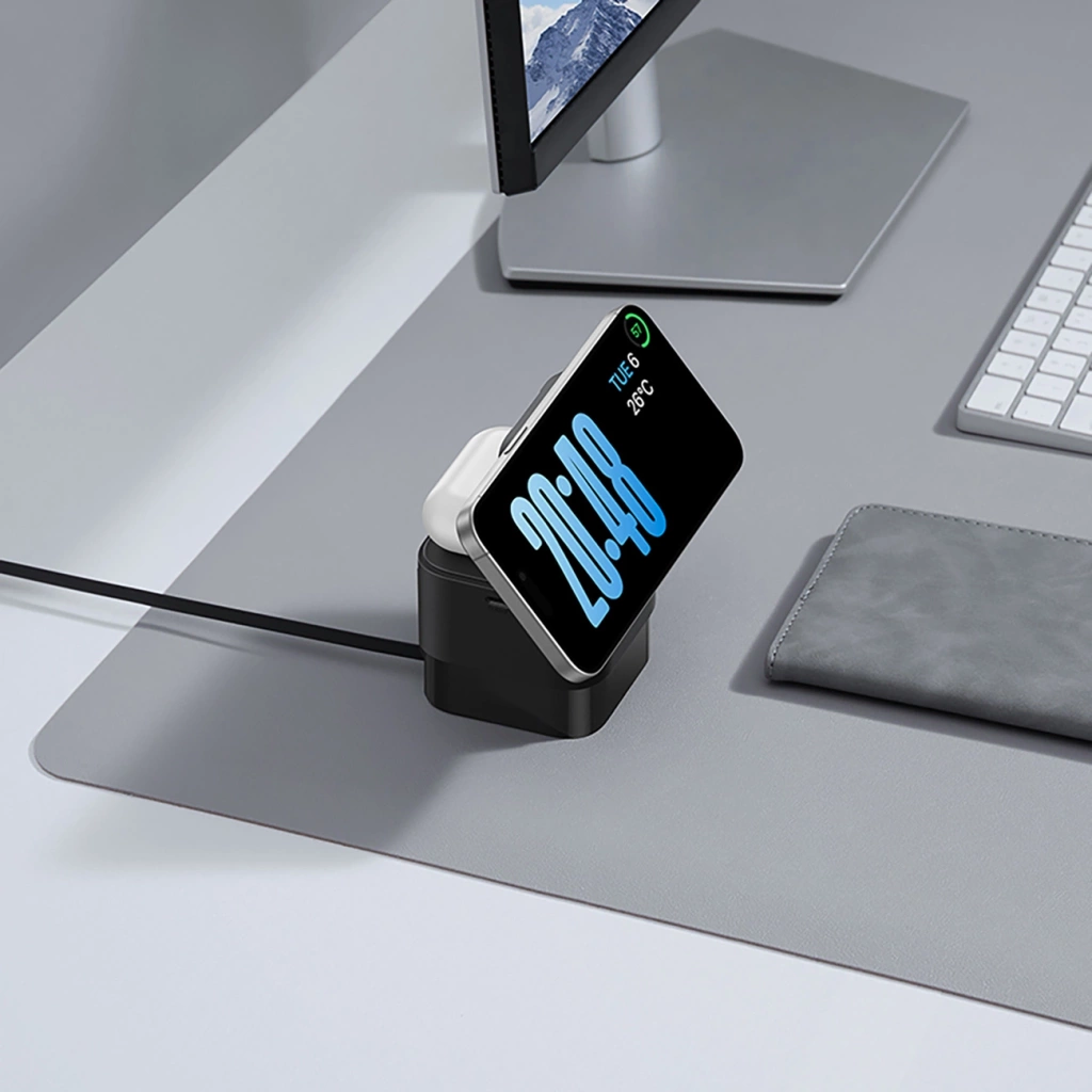 Baseus MagPro to kompaktowa stacja ładowania 3w1, która zadba o Twój telefon, słuchawki i zegarek jednocześnie – bez potrzeby używania trzech oddzielnych ładowarek.