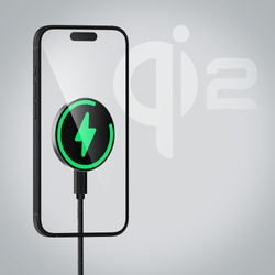 Qi2 to najnowszy na rynku standard, który oferuje szybsze ładowanie, większą wydajność oraz lepszą stabilność dzięki zastosowaniu magnesów umożliwiających precyzyjne dopasowanie urządzenia do ładowarki. Ładowarka ładuje z mocą do 15 W, co umożliwia szybkie i bezpieczne uzupełnienie energii w nowszych modelach smartfonów takich producentów jak m.in. Apple, Samsung, Huawei czy Xiaomi.