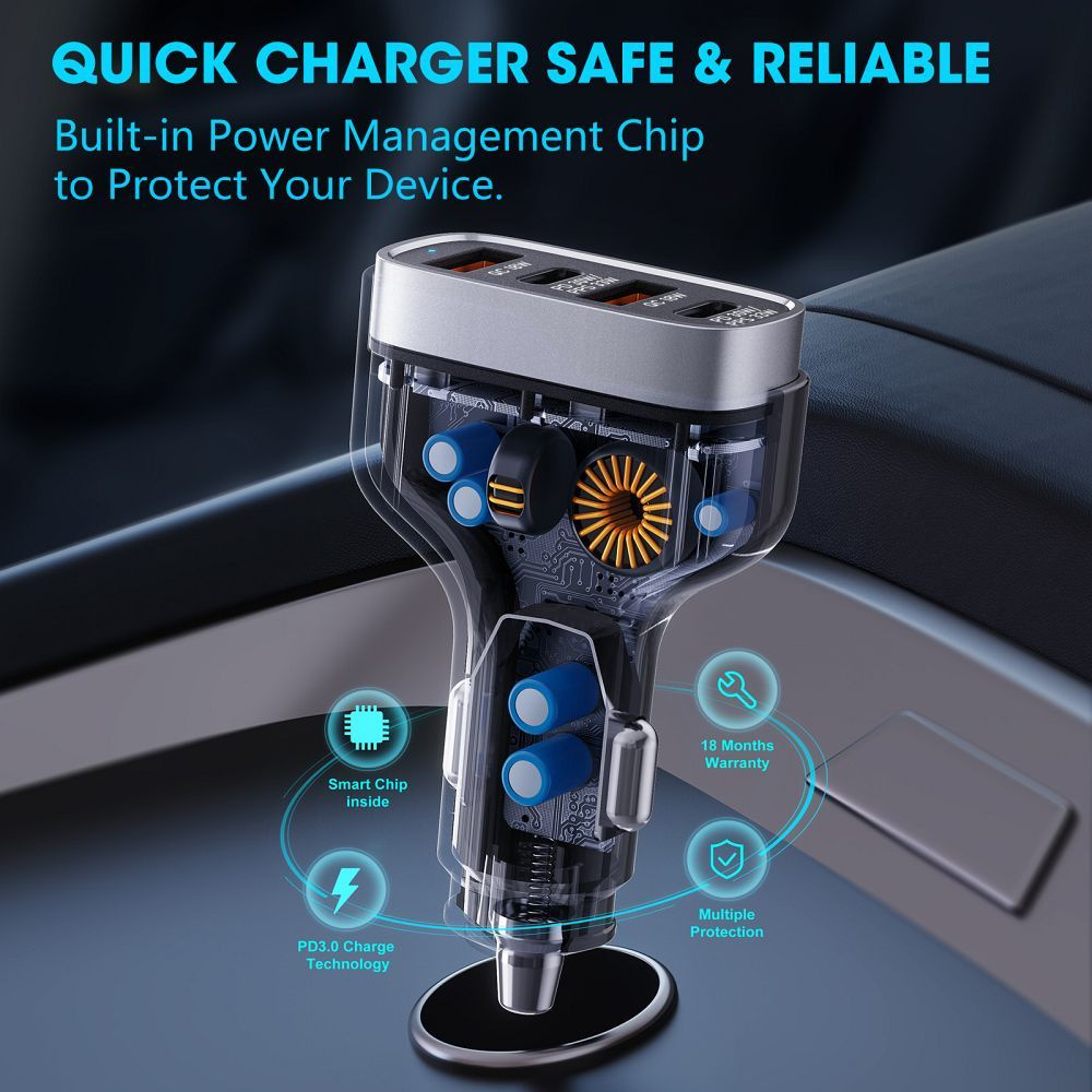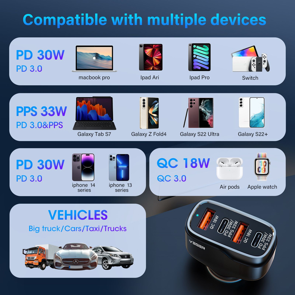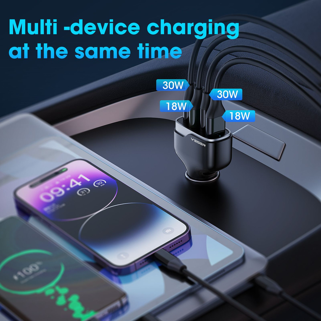 Ładowarka samochodowa Veger z funkcją szybkiego ładowania i czterema portami. Pozwala na błyskawiczne ładowanie urządzeń mobilnych w samochodzie.