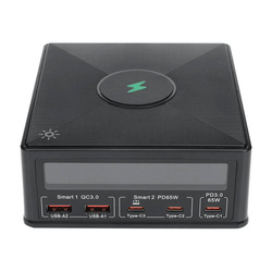 | Wyjście | USB-C1: 5V/3A, 9V/3A, 12V/3A, 15V/3A, 20V/3.25A PPS: 3.3-11V /5A, 3.3-21V/3A 65W(Max) USB-C2/USB-C3: 5V/3A, 9V/3A, 12V/3A, 15V/3A, 20V/3.25A PPS: 3.3-11V /5A, 3.3-21V/3A 65W(Max) USB-C2 + USB-C3: 20W + 45W ; USB-A/USB-A2: QC3.0 5V/3A, 9V/2A, 12V/1.5A, 4.5V/5A, 5V/4.5A 22.5W(Max) ; USB-A1 + USB-A2: 12W + 12W |